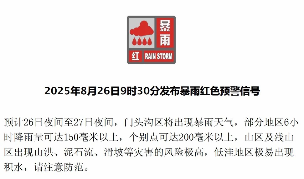 China.com在8月26日报道说,根据微信的官方报道“气象北京”,北京许多地区的气象天文台发布了风暴警告信号。 Menteugou地区和Fangshan地区气象天文台发布了大雨的红色警告信号。预计从26晚到27日晚上,大雨将在Mentegou地区举行。某些地区的6小时降雨可能超过150毫米,有些点可以达到200毫米以上。山区和浅山地区的山洪流,泥石流,滑坡和其他灾难的风险很高,低区域容易受到水的积累。请注意避免。预计,从27日的26日晚上到晚上,将发生下雨的降雨,而Disfangshan的卡车将发生6小时以上的降雨量超过150毫米,或者超过200毫米的24小时降雨。次要灾难,例如山洪流,泥浆DES,山体滑坡等可能发生在山区和浅山地区,并且水积聚容易受到低区域的影响。请注意谨慎。图像来源:“北京气象”微信公共帐户Huairou区和Changing District气象天文台发布了一次大雨的橙色警告信号。预计从午夜到26日至27个晚上,Huairou地区将会有一个强烈的降雨过程。在某些地区下雨在6小时内超过100毫米,某些地区的降雨在24小时时的降雨量超过150毫米。山的洪流,降落,滑坡和其他由Mastrength雨季造成的灾难可能发生在山区和浅的山区和浅山地区。水积聚容易受到低区域的影响。请注意避免。希望从26个晚上到第27夜,昌平地区将有大雨。在某些地区下雨更多在6小时内进行100毫米,在某些地区的降雨在24小时后超过150毫米。在山区和浅山地区可能发生山洪流,泥石流,滑坡和其他由大雨造成的次要灾难。水积聚容易受到低区域的影响。请注意谨慎。